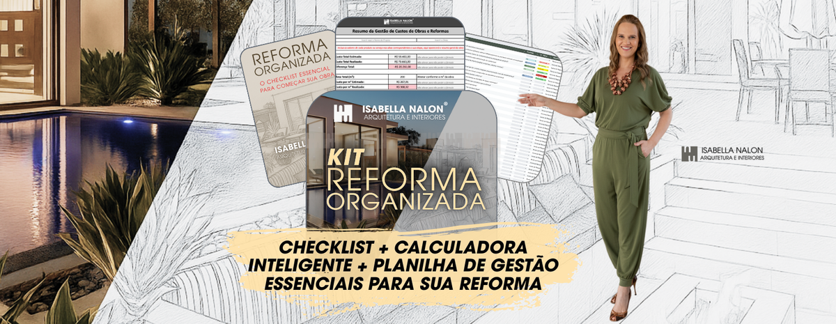 Criado pela arquiteta Isabella Nalon, com mais de 30 anos de experiência, o Kit REFORMA ORGANIZADA é o passo a passo simples e prático para transformar qualquer reforma ou obra em um processo leve, organizado e sob total controle.